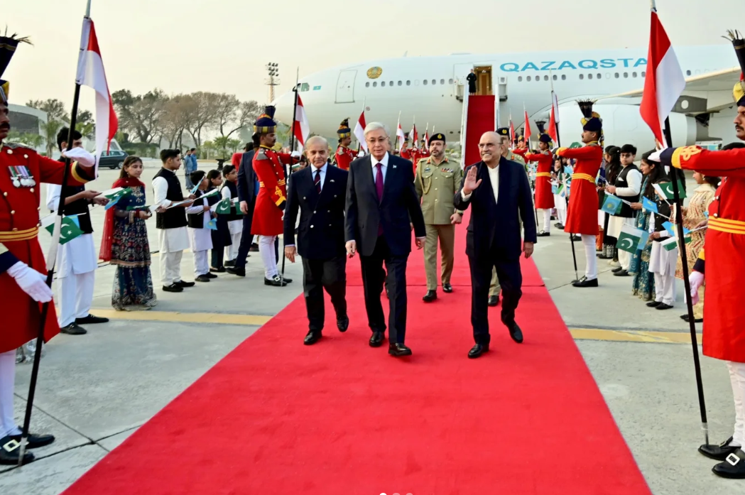 Kazakhstan’s President Kassym-Jomart Tokayev arrived in Pakistan on Tuesday for his first official state visit, signaling a new chapter in bilateral relations between the two countries. He was warmly welcomed at Nur Khan Airbase by President Asif Ali Zardari and Prime Minister Shehbaz Sharif, highlighting the importance of the visit at the highest levels of leadership.