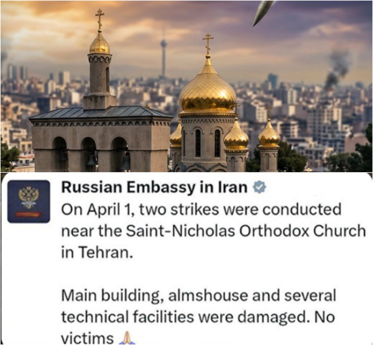 The Russian Embassy in Iran reported that two missile strikes hit close to the Saint Nicholas Orthodox Cathedral in the Iranian capital. The blasts damaged the main church building, an almshouse (elderly care home), and several technical facilities.